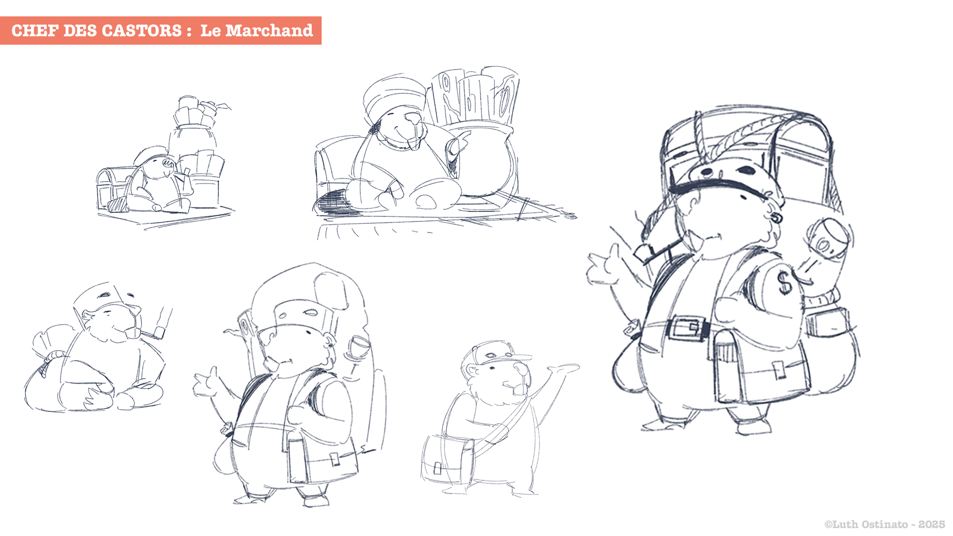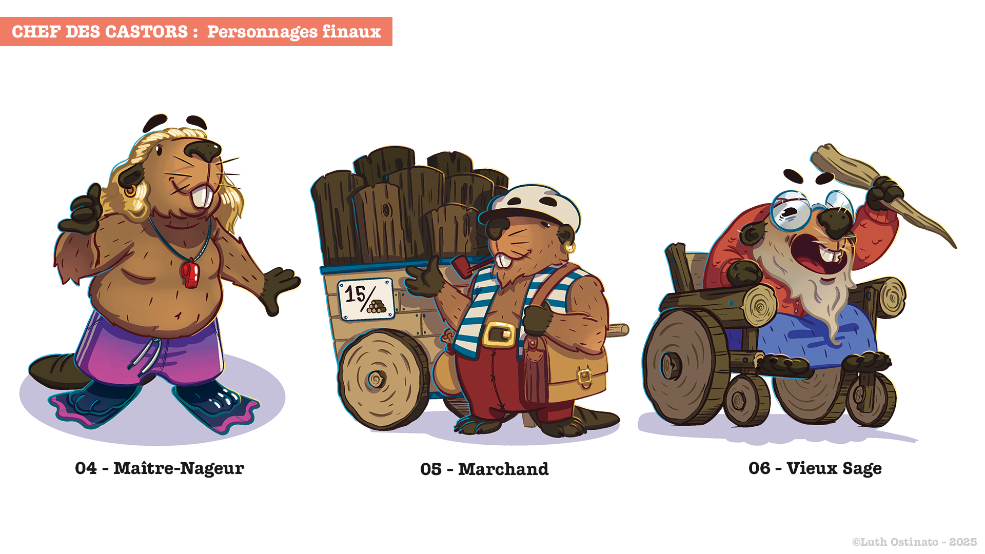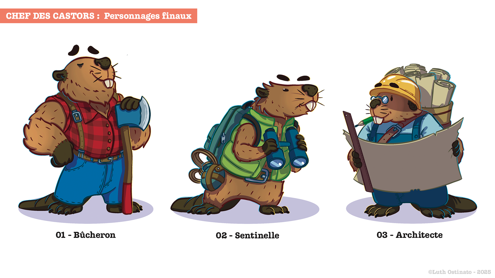 Pour la mascotte, il fallait rester en adéquation avec le design des personnages sans pour autant en mettre un en valeur par rapport aux autres. L'idée d'un citoyen castor lambda devenu roi après une partie était très vite trouvée et nous faisait bien rire.