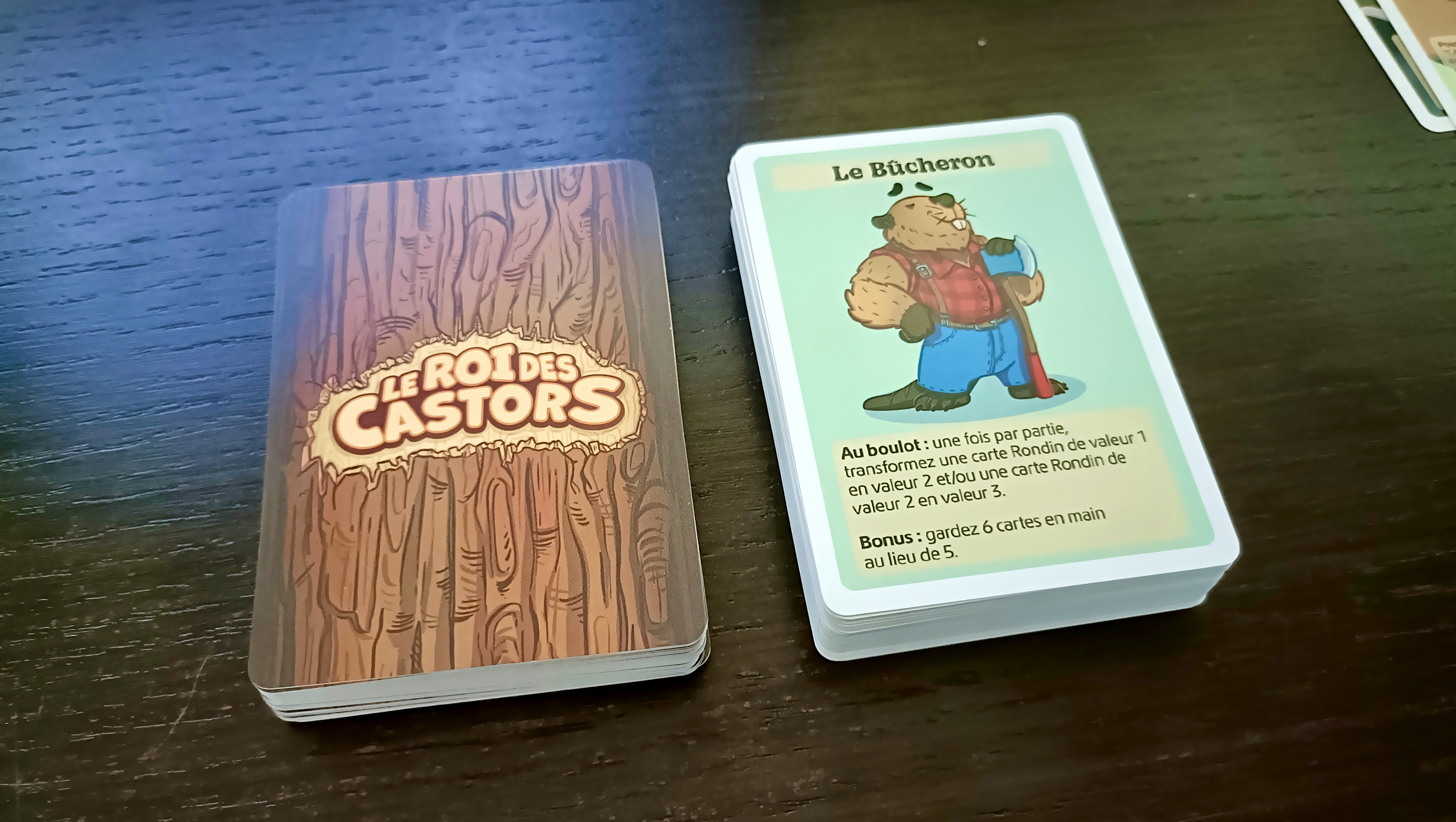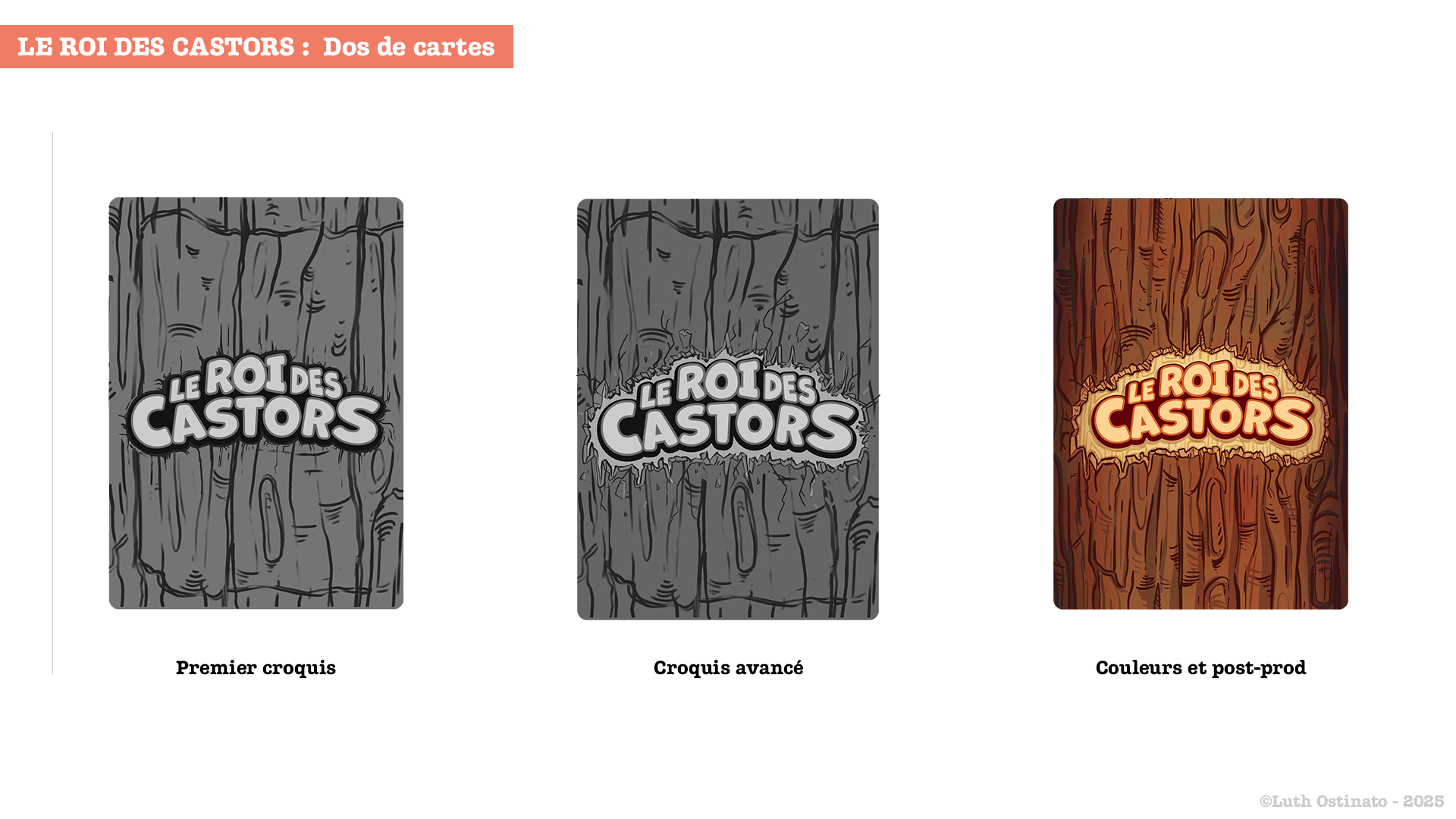 Le jeu s’appelant Le Roi des Castors, l'idée était toute trouvée de partir des rondins et de leur écorce pour conceptualiser un dos de carte marquant. Les inspirations provenant principalement des dos de cartes du jeu Hearthstone de