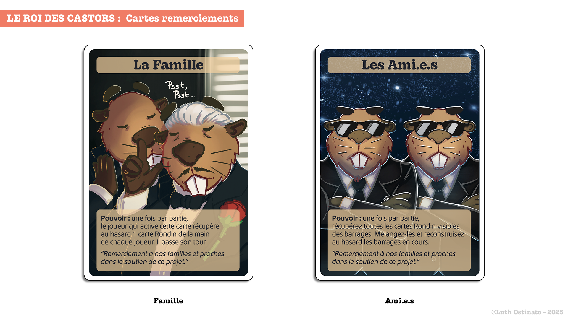Ces quatre cartes sont présentes dans le jeu initialement pour remercier les contributeur.ice.s et celles et ceux qui se procurent le jeu. Mais très vite Mickaël eut la brillante idée de les rendre optionnellement jouables dans le jeu afin de pimenter un peu plus les parties.