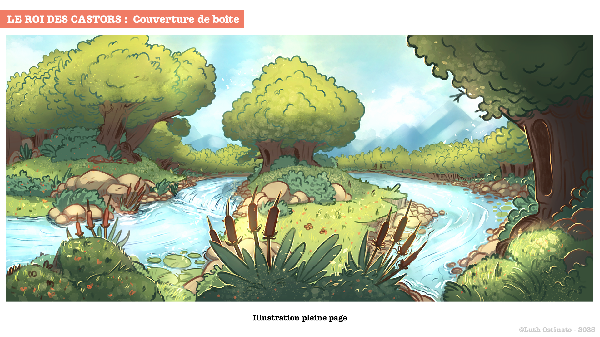 Pour la boîte du jeu, nous voulions avec Mickaël quelque chose de champêtre, chaleureux et joyeux. Montrer l'univers dans lequel vivent nos chers castors et qui sera le théâtre des joutes de barrages à venir.